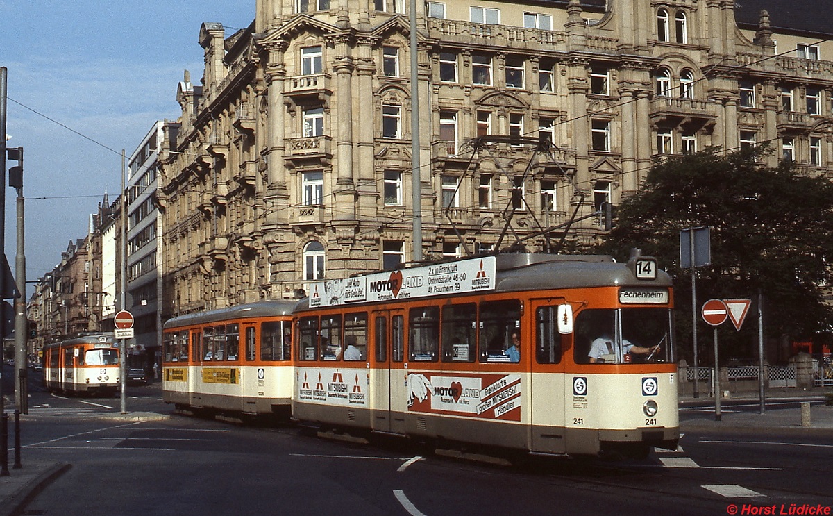 Die Frankfurter Straßenbahn gehörte zu den letzten Betrieben in Westdeutschland, die noch Vierachser einsetzten, hier L-Tw 241 im Sommer 1986 auf der Linie 14 nach Fechenheim