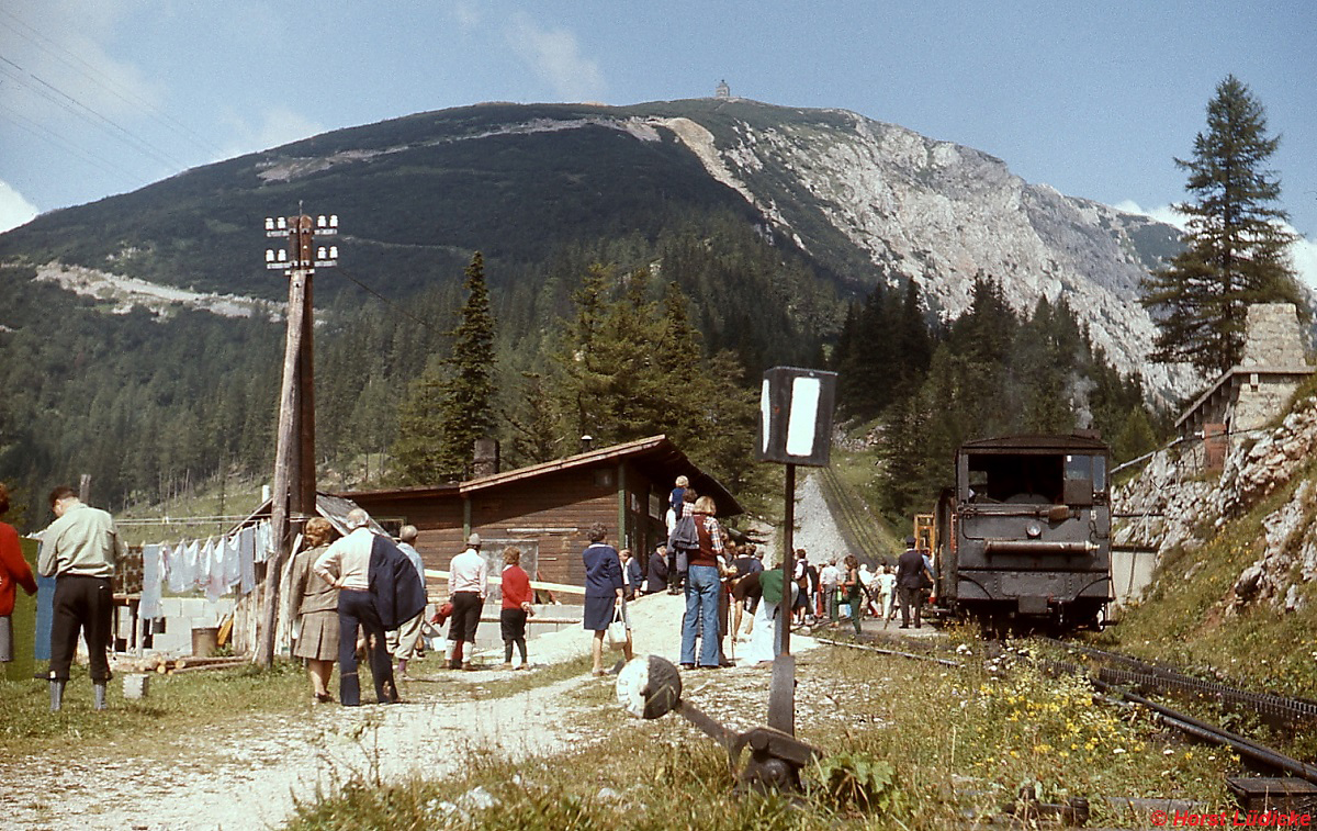 Ein Zug der Hochschneebergbahn Anfang August 1975 in der Haltestelle Baumgartner. Hier müssen die Dampflokomotiven für die weitere Bergfahrt nochmals Wasser nehmen. In dem wasserarmen Kalkmassiv musste das Wasser bis zum Bau einer Wasserleitung durch Versorgungsszüge zur rechts sichtbaren Wasserstation transportiert werden. Direkt hinter der Station beginnt der steile Anstieg über die Hohe Mauer in Richtung Bergstation. Diese befindet sich in unmittelbarer Nähe der auf der Bergspitze in der Mitte sichtbaren Elisabethkirche. Die Fahrgäste nutzten die Pause, um sich die Füsse zu vertreten oder sich in der Restauration mit den hausgemachten Buchteln zu versorgen. An der Kleidung der Fahrgäste sieht man, dass es damals noch keine Outdoortextilien von Jack Wolfskin gab.