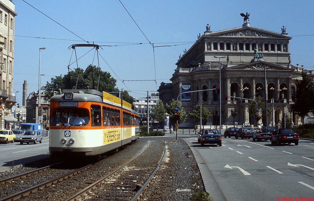 Vor der Kulisse der Frankfurter Oper ist M-Tw 607 auf der Linie 12 nach Höchst unterwegs (Sommer 1986)