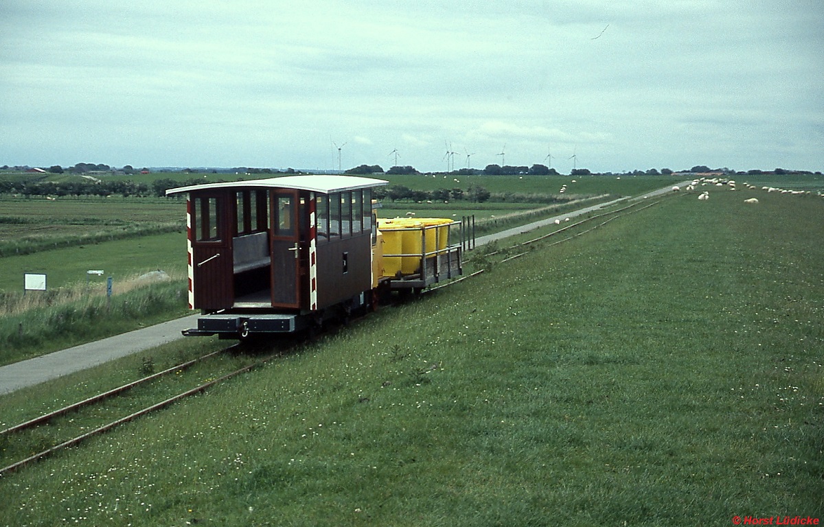 Zwischen dem  Personenwagen  und dem Transportwagen für die gelben Tonnen der Halligbewohner ist die Schöma-Lok des Amtes Dagebüll kaum zu entdecken, hier am 14.06.2010 kurz vor dem Bauhof auf der Dagebüller Deichkrone.