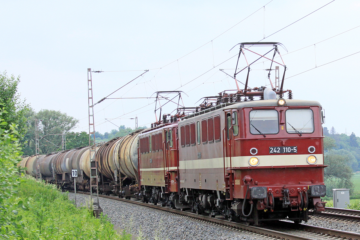 242 110-5 u.242 145-2 am 06.06.2019 nördlich von Salzderhelden am Bü75,1 in Richtung Hannover mit Kesselwagen