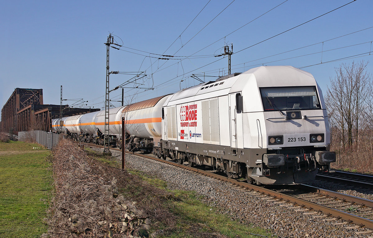 Güterzug mit Lokomotive 223 153 am 24.02.2021 in Duisburg.