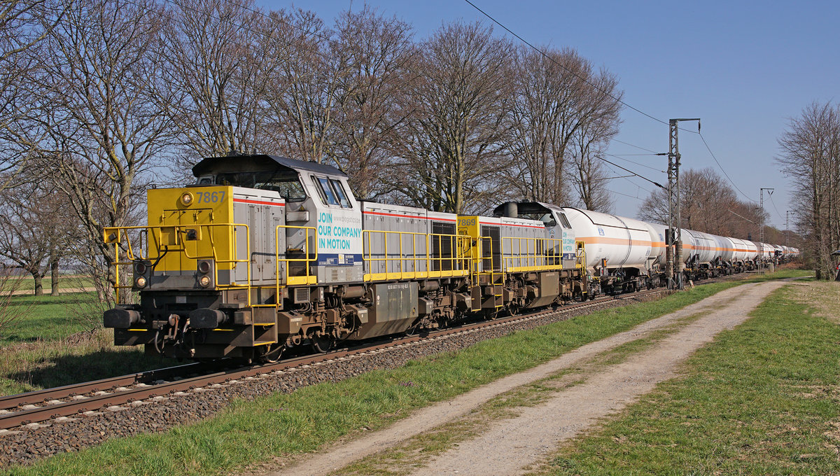 LINEAS Disellokomotiven 7867 und 7869 mit einem Kesselzug am 31.03.2021 in Boisheim.