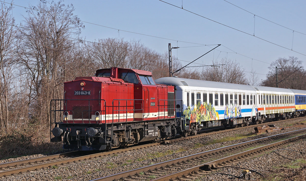 Lokomotive 203 843-8 am 24.02.2021 mit Reisezugwagen in Duisburg.