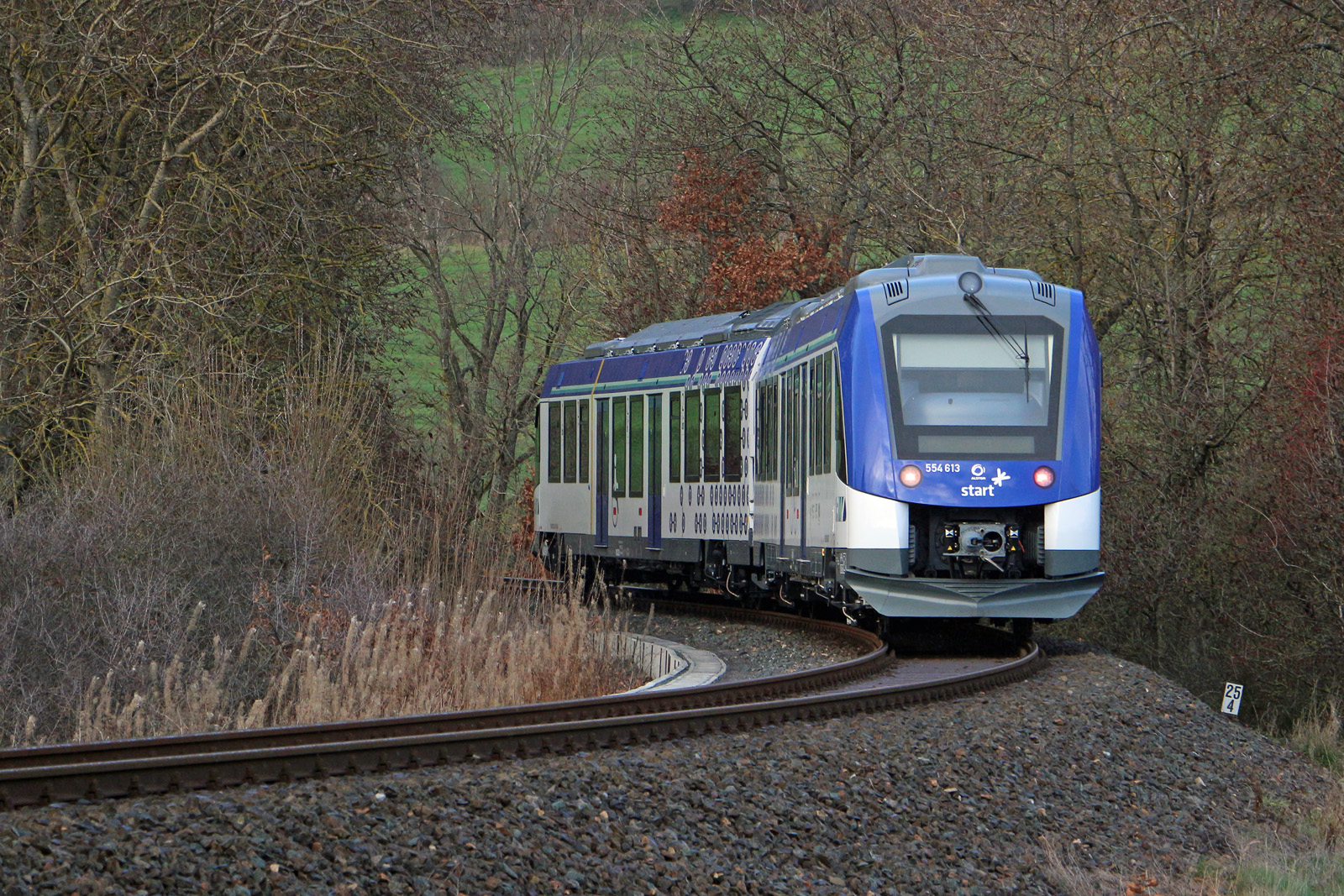 Die Änderungen des Betreibers auf der RB15 im RMV standen unter keinem guten Stern. Während einige Lokalpolitiker noch von einem  etwas holprigen Start  sprachen, ist die Meinung der Fahrgäste, die auf die Bahn angewiesen sind, etwas drastischer, der Begriff Debakel ist da noch eine der freundlicheren Beschreibungen. Es gab Tage, das fuhr nicht ein Zug! Da auch keinerlei Informationen -weder telefonisch noch auf den gängigen Portalen- zu eventuellen Ersatzangeboten zu bekommen waren, haben sich in den letzten beiden Wochen wohl viele Fahrgäste vom ÖPNV verabschiedet, man kann es ihnen nicht verdenken, bei -10 Grad wartet niemand gerne eine unbestimmte Zeit. Am 24.12.2022 fuhr aber der Triebzug 554 613 in Richtung Grävenwiesbach und hat bald den Hp Hundstadt erreicht.