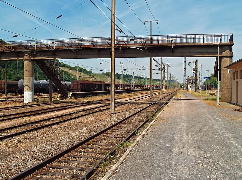 Der deutsch-französische Grenzbahnhof Apach, an der Mosel gelegen, verfügt über umfangreiche Bahnanlagen, grenzüberschreitender Personenverkehr findet meines Wissens derzeit (10.06.2006) aber nicht statt