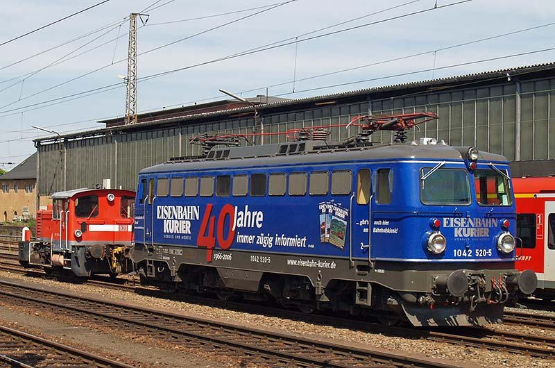 Die  schön bunte  EK-Lok 1042 520 hat sich am 10.06.2006 im Bahnhof Trier ins beste Licht gesetzt