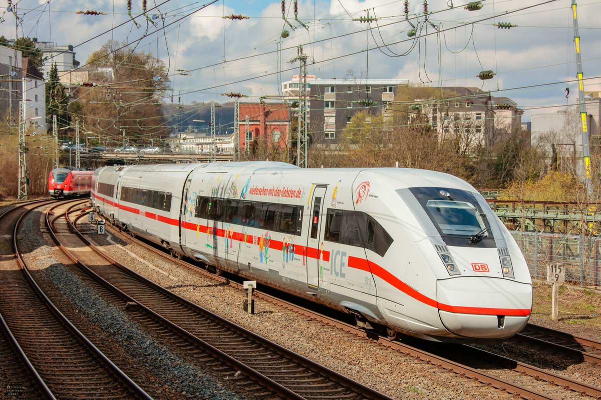 DB ICE 412 218 "Wiedersehen mit den Liebsten" DB mit ICE557 nach Berlin in Wuppertal, April 2021.
