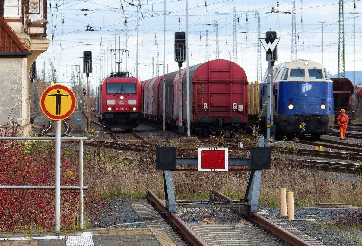 Für sonstige Verhältnisse richtig viel los war am 28.11.2019 im Rangierbahnhof Nordhausen. Die blaue ITB V180 stand abfahrtbereit mit leeren Holzwagen. 185 305 hatte die mittleren wagen gebracht und wartete ebenfalls auf die Rückfahrt