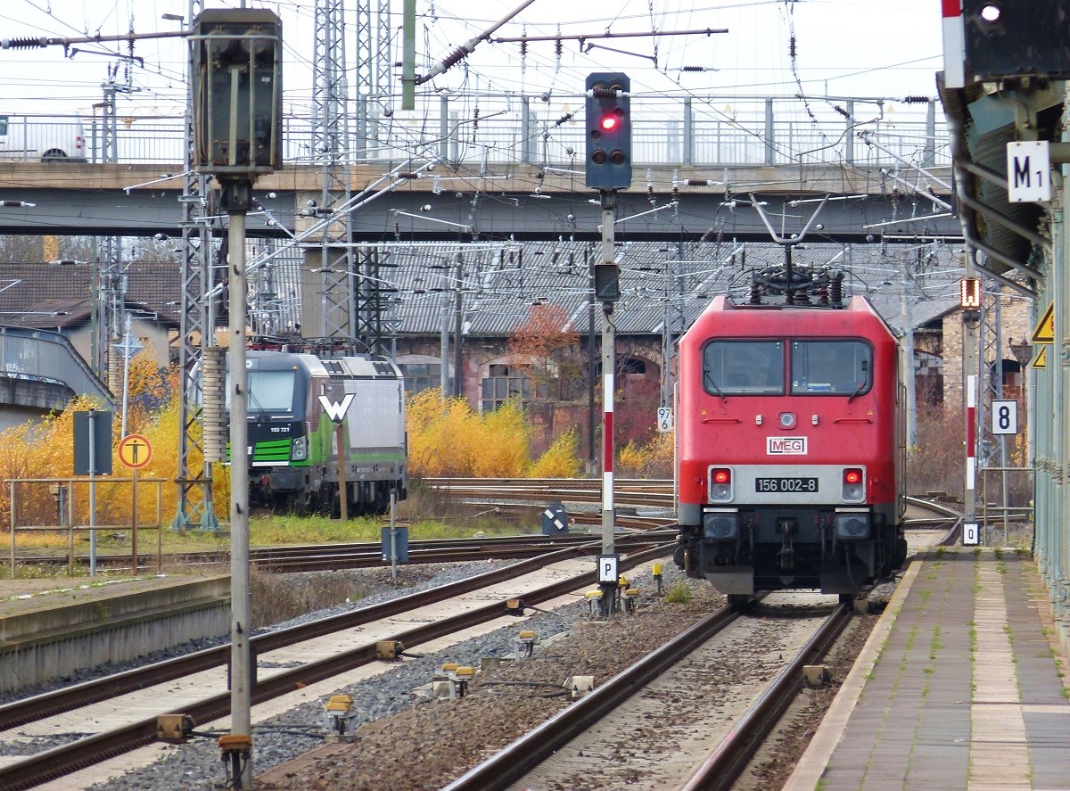 MEG 156 002-6 setzt sich in langsam in Bewegung nach einem Zwischenhalt im Bahnhof Nordhausen. leider schafffte ich nur noch eine Teleaufnahme vom anderen Ende des Bahnsteigs. 28.11.2019