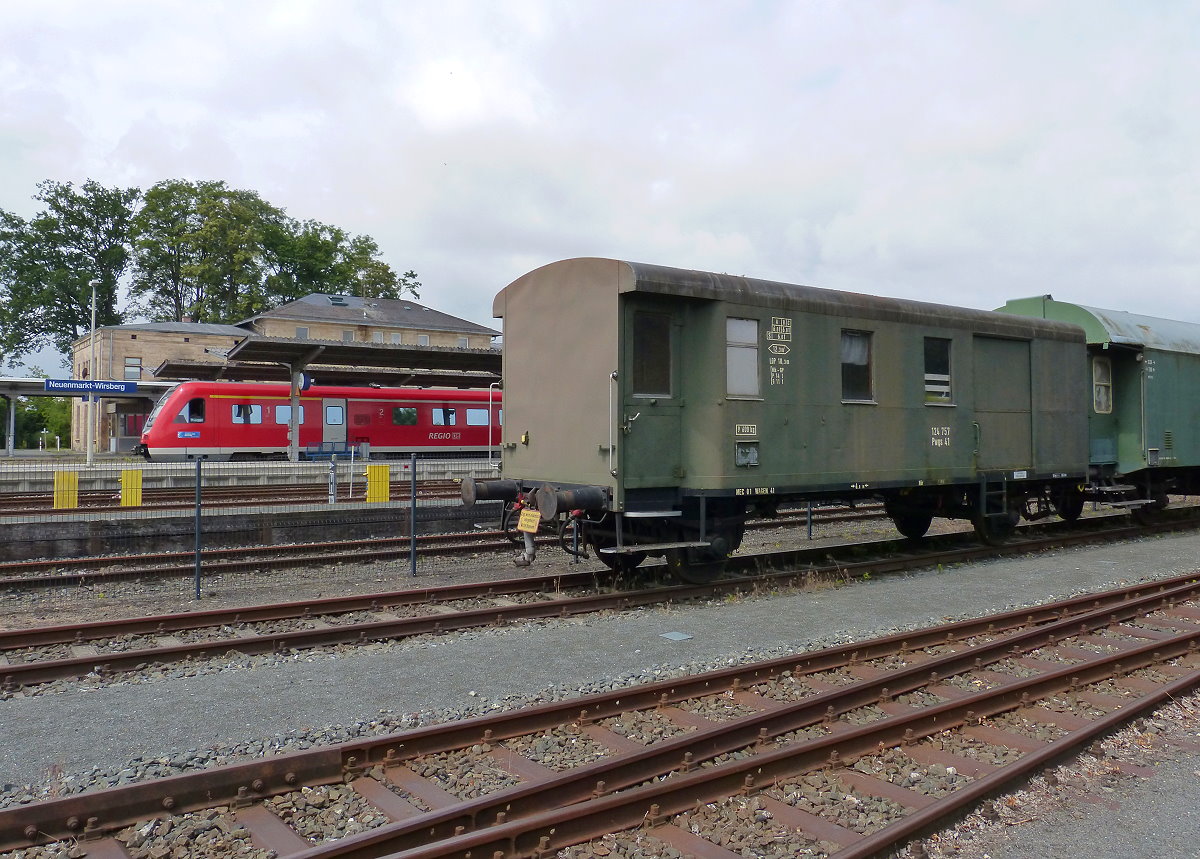 Blick aus dem Museum Neuenmarkt Wirsberg auf den Bahnhof heraus am 14.07.2019 Mit im Bild die Donnerbüchse Pwgs 41 124 757.