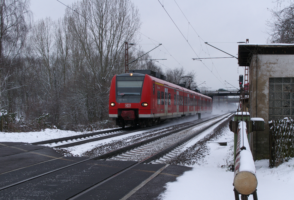 425 132 ist als Regionalbahn Trier - Homburg/Saar unterwegs. In der Nacht hatte es leicht geschneit, sodass der Triebwagen eine leichte Schneefahne hinter sich her zog. Hier bei der Anrufschranke in Saarlouis-Roden. Wir stehen immer sicher innerhalb des Geländers des Fußgängerüberweges. KBS 685 15.01.2013