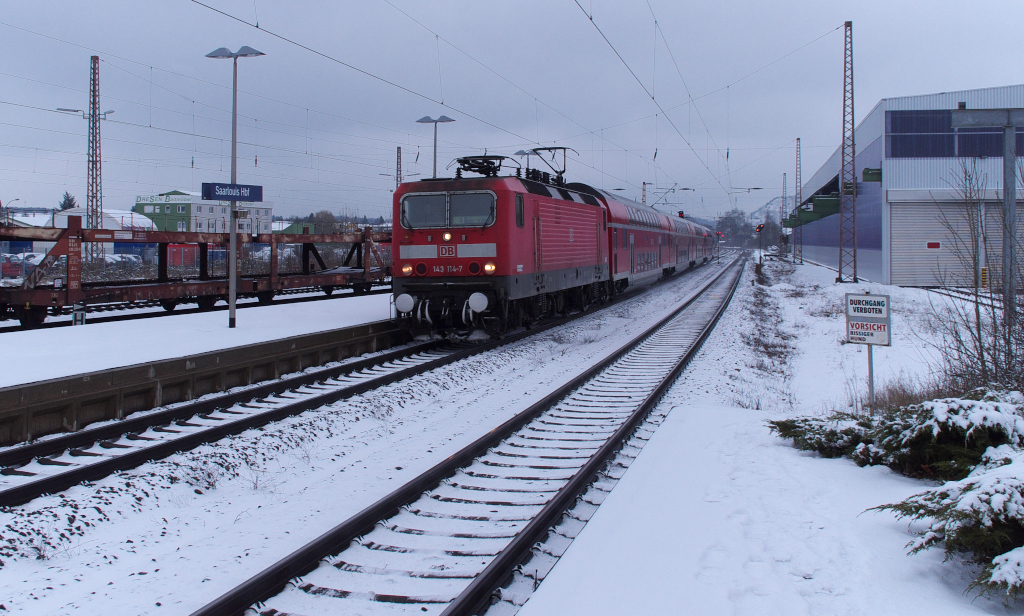 Am 15.01.2013 hat 143 114 mit ihrem RE nach Koblenz Einfahrt in den Hauptbahnhof von Saarlouis.