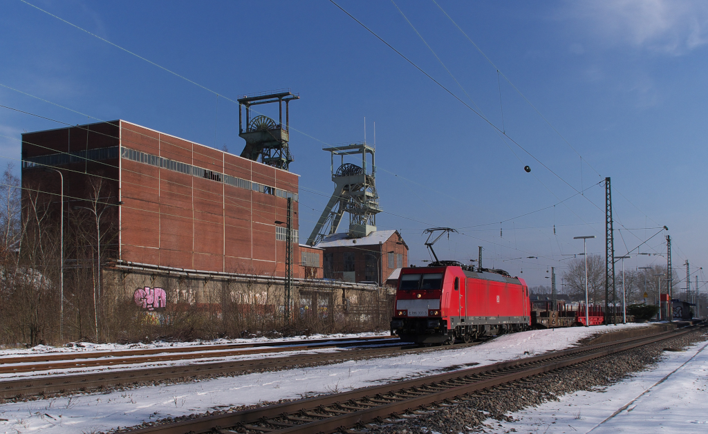 Die Wintersonne lockte uns am 24.01.2013 hinaus an die Strecken. Zuerst ging es nach Luisenthal bei Völklingen. (E) 186 331-5 bringt leere Wagen zurück zu Saarstahl nach Völklingen. Am Morgen hatte sie den Zug mit Brammen und Eisenträgern von Völklingen nach Neunkirchen gebracht, dort wird die Ladung weiter verarbeitet. Im Hintergrund die Reste der ehemaligen Grube Luisenthal. Am 7 Februar 1962 fanden dort bei einer Schlagwetterexplosion 299 Bergleute den Tod. Unser Standpunkt war das ehemalige Gütergleis in Luisenthal, von hier wurden vor Mora C das Drahtwerk von Saarstahl in Luisenthal bedient und der Baustoffhändler "Niederer" hatte einen Gleisanschluß. KBS 685
