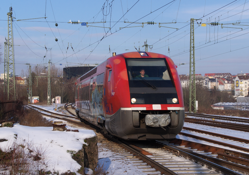 Ein SNCF "Baleine Bleu", obwohl er DB verkehrsrot ist, macht sich auf den Weg über die französische Grenze nach Forbach. Der Typ X 73900 (BR 641) wird von TER Lorraine eingesetzt. Zwei Fahrzeuge ((X 73914 und 73915) gibt es in DB Rot, wenn auch die Farbe und das DB Emblem schon etwas gelitten haben. Um welches Fahrzeug es sich handelt ist leider nur an der Seite des Triebwagens zu erkennen. KBS 682 - 24.01.2013