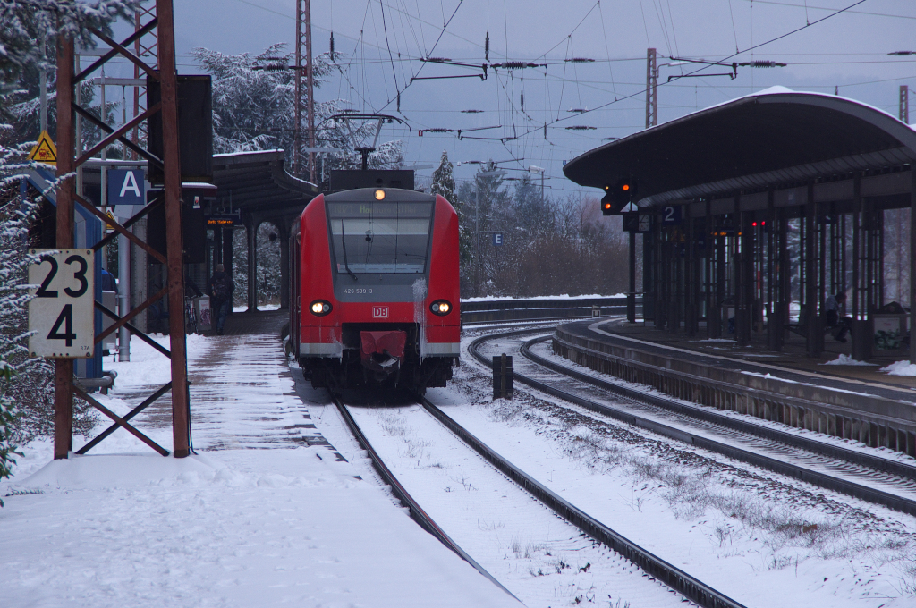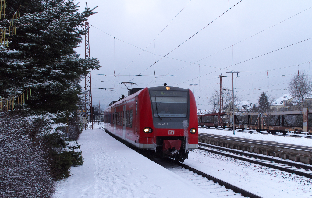 Nur ein paar Tage hielt sich der Schnee im Saartal. Am 15.01.2013 hatte es doch ordentlich geschneit, die Sonne des Vortages war gewichen und ein trostloses Grau machte sich breit. Als ich von 1990 bis 1997 regelmäßig mit der Bahn nach Saarbrücken zur Arbeit fuhr (Jahresabbo) da konnte man von dieser Stelle aus noch das Bahnhofsgebäude sehen. Heute verdecken noch gewachsene Bäume und Sträucher den Blick. 426 039 fährt als Regionalbahn nach Homburg/Saar aus dem Hauptbahnhof von Saarlouis aus. KBS 685