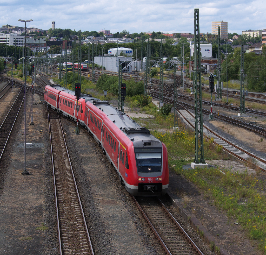 612 463 und 612 105 als RE 3786 Dresden - Hof haben Einfahrt nach Hof Hbf. Nach 3 Minuten Aufenthalt läuft das Pärchen als RE 3460 weiter nach Nürnberg. 05.08.2012 Erhard Pitzius
