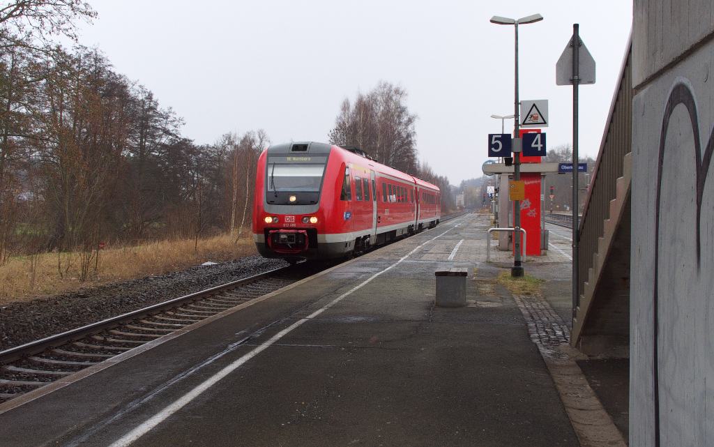Die RE fahren abwechselnd stündlich ab Hof entweder nach Lichtenfels oder Bamberg, eine direkte Verbindung nach Würzburg gibt es nicht mehr.