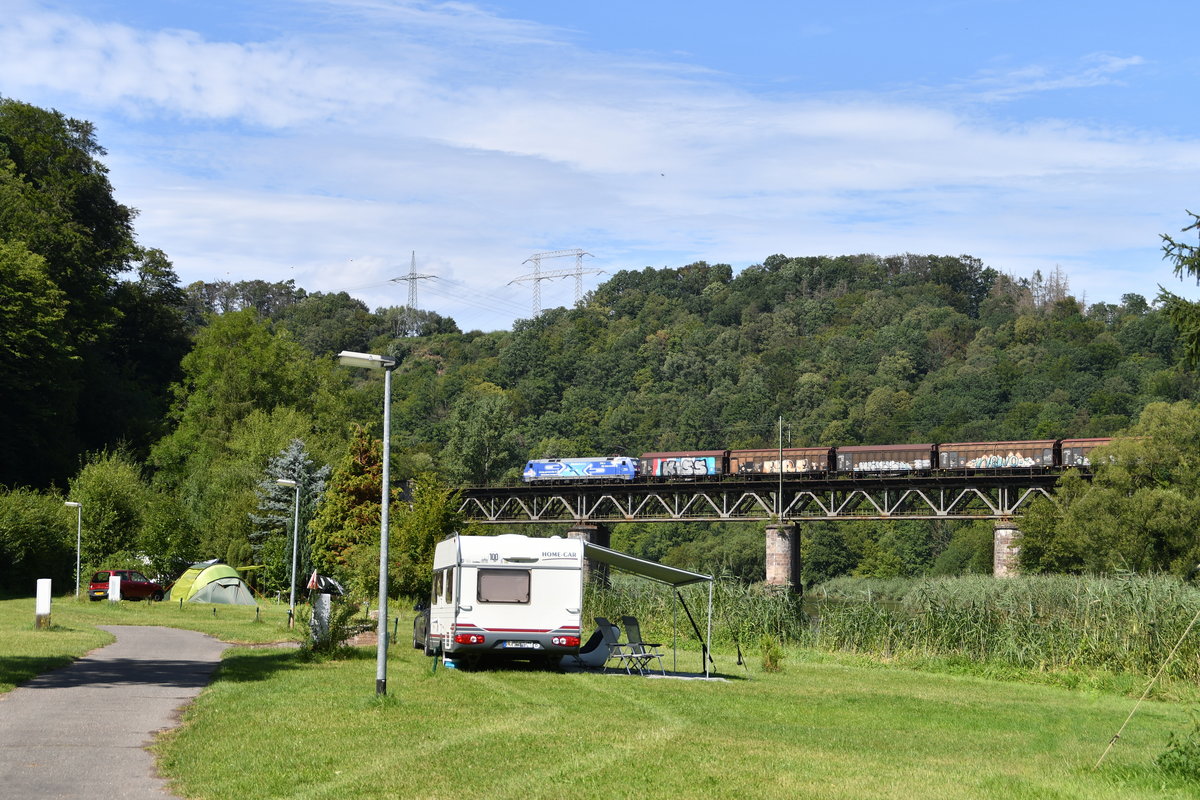 TFG Albatross 152 13x mit einem gemischten Güterzug am 11.08.2019 auf der Werrabrücke bei Hedemünden
