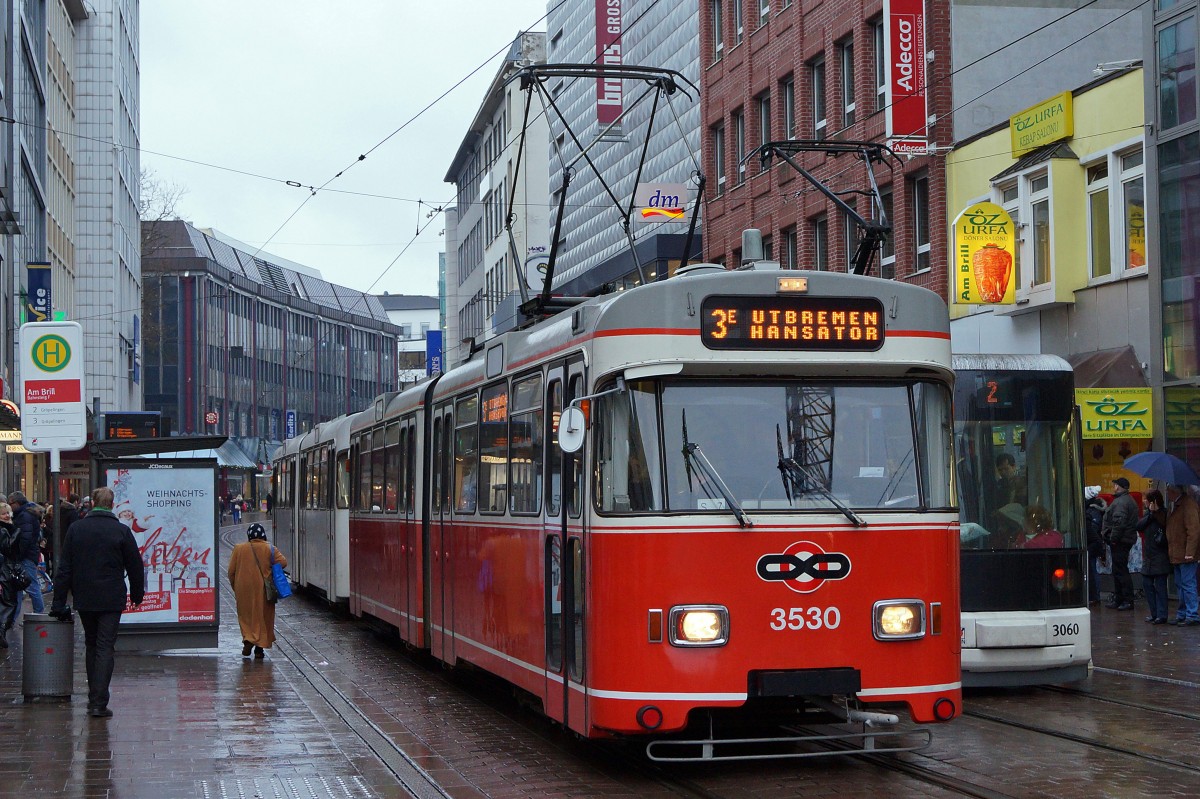 BSAG: WEGMANNTRAMZUG GEHT ENDE 2013 IN PENSION. Am 7. Dezember 2013 war der letzte noch für den Plandienst zugelassene Wegmanntramzug, bestehend aus dem GT6 3530 und dem Beiwagen 3734, wegen dem Fussballspiel SV Werder Bremen gegen FC Bayern München zum zweitletzten Mal im Linieneinsatz auf der 3E. Die Wegmannzüge standen seit dem Jahre 1973 bei der BSAG im Einsatz. Wegen Ablauf der Zulassungsfrist wird dieser Zug per 31. Dezember 2013 ausrangiert. Während sich der grosse Strassenbahnfan aus der Schweiz zusammen mit den Freunden der Bremerstrassenbahn e.V. über diesen Einsatz freute, waren die Fussballfans von Bremen sehr enttäuscht über die grosse Niederlage 0 : 7. Eine Wegmaneinheit wird als Museumszug der Nachwelt erhalten, ein GT6 plus Beiwagen befindet sich im Hannoverschen Strassenbahnmuseum und weitere Wegmannzüge leisten noch wertvolle Dienste in Rumänien. Eine meiner letzten Aufnahmen dieses formschönen Zuges ist am 7. Dezember 2013 am Brill in der Hansestadt Bremen entstanden.