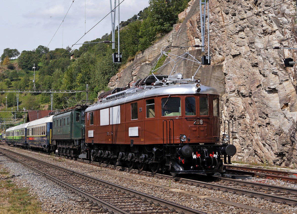 100 Jahre BLS: Ae 6/8 208 und Ae 4/7 10997 mit den Wagen des PRESTIGE CONTINENTAL EXPRESS  LE SALON BLEU   bei der Durchfahrt Ausserberg am 7. September 2013.