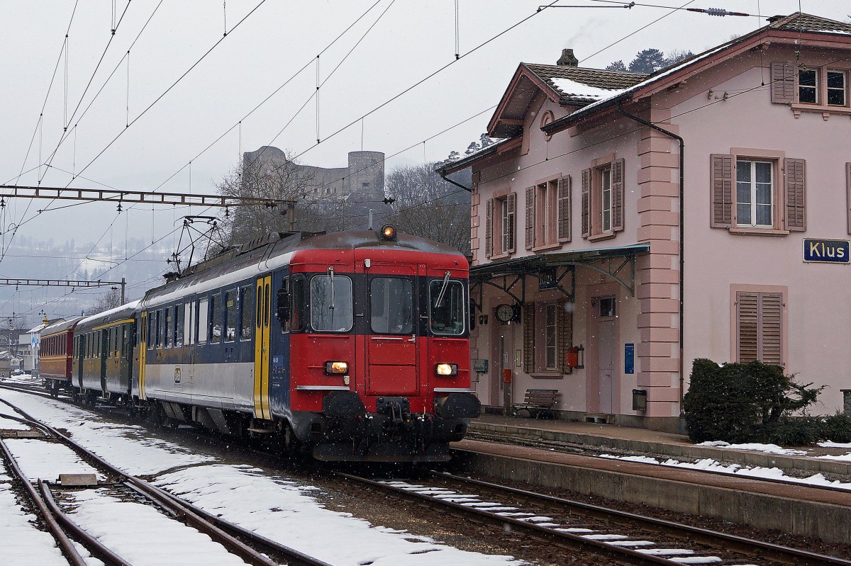 MONAT FEBRUAR: OeBB RBe 205 ex SBB auf der Station Klus bei Balsthal mit Schloss Alt-Falkenstein am 23. FEBRUAR 2013, während einem leichten  Schneegestöber .