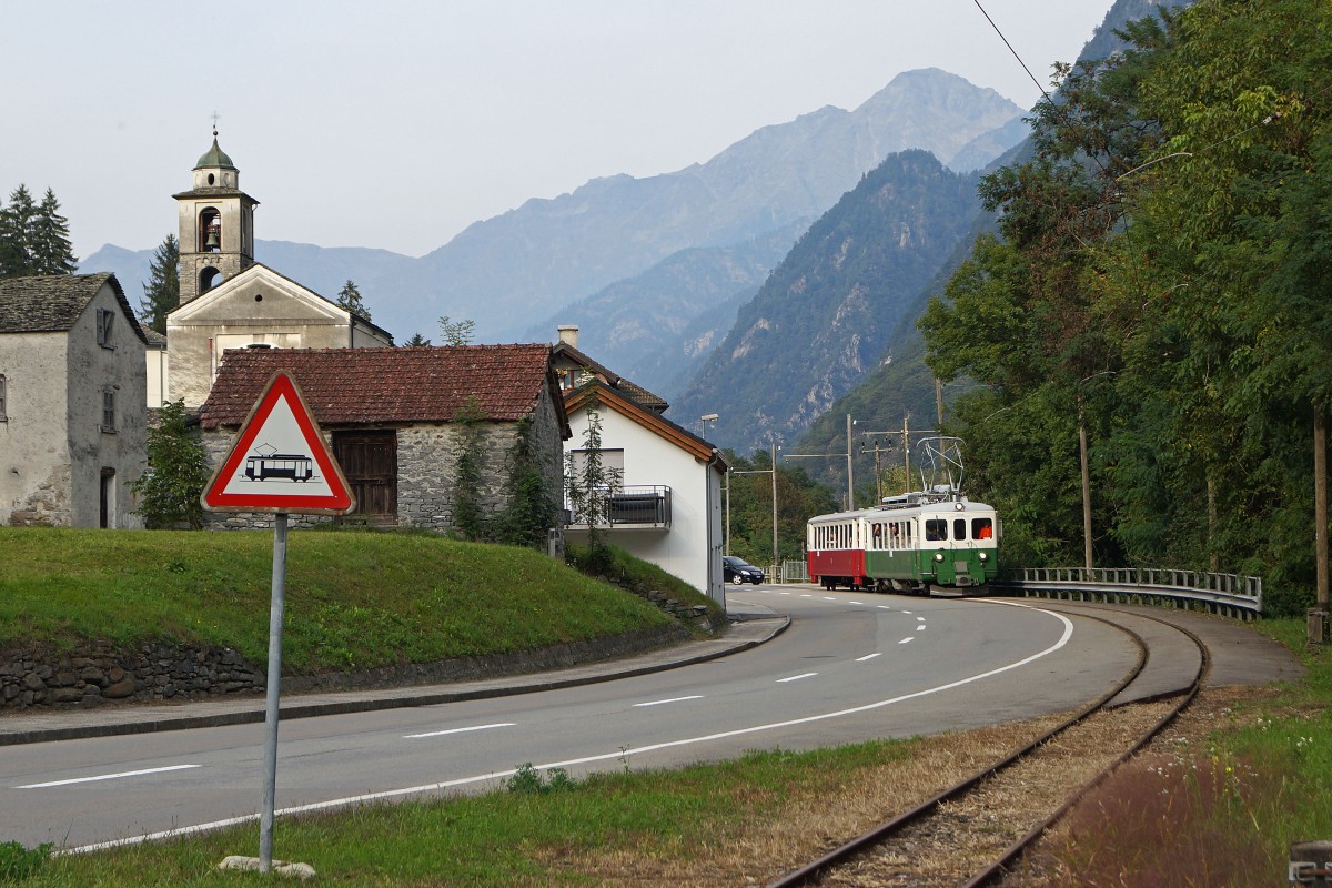 Monat SEPTEMBER: Einer der letzten Züge im Misox bestehend aus dem ABe 4/4 5 (ex BA/OJB/BTI) und dem Bt 29 (ex SZB) bei Leggia am 22. SEPTEMBER 2013.