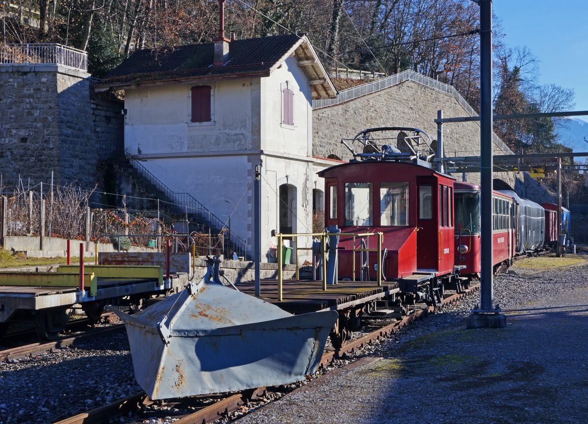 MVR/CEV: Am letzten Tag vor Weihnachten wartet der arbeitslose Te 2/2 82 mit Schneepflug in Vevey bei herrlichem Frühlingswetter auf den Winter. Die Aufnahme ist am 23. Dezember 2013 in Vevey entstanden.