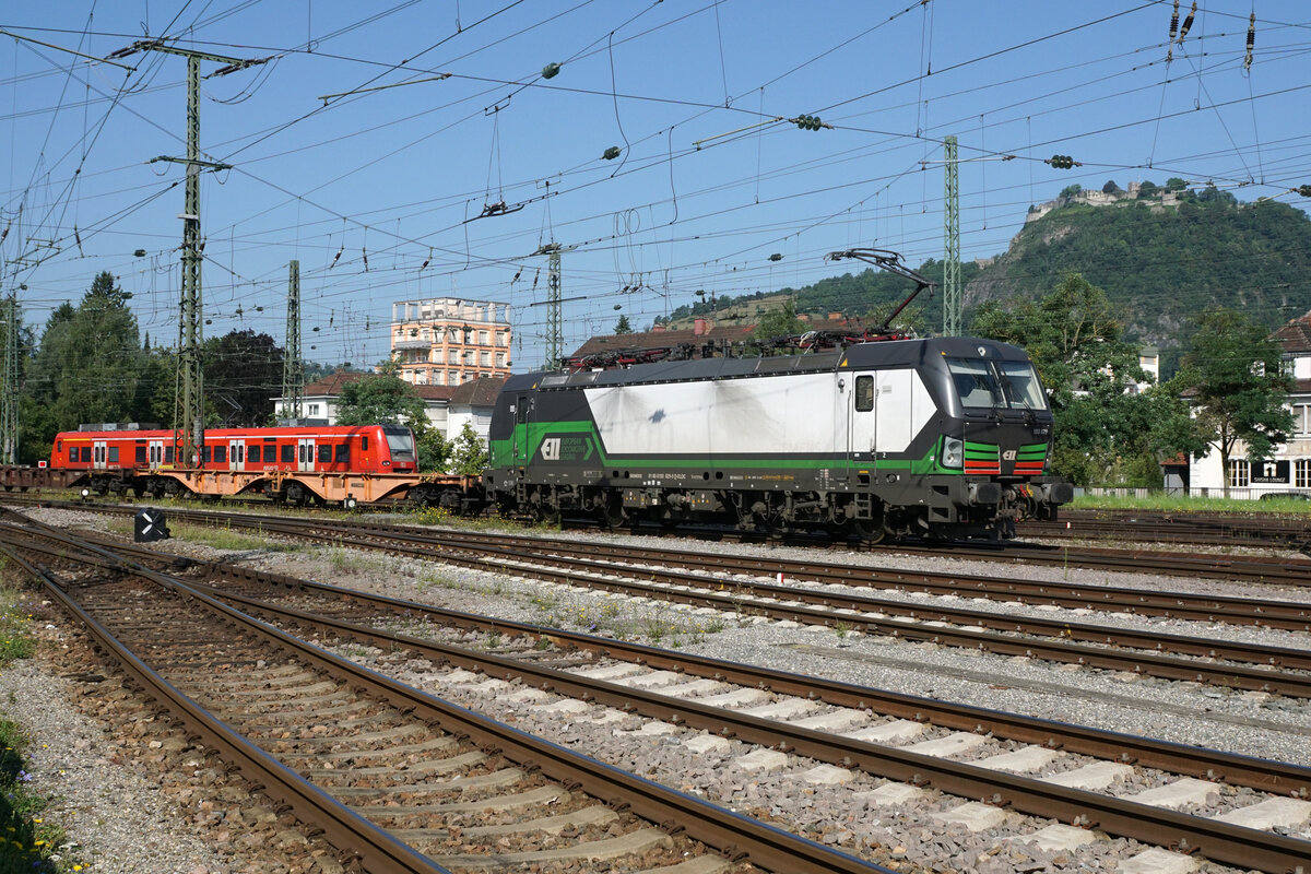 GROSSER BAHNHOF SINGEN am 14. August 2021. Infolge Sperrung der Rheintalbahn während drei Wochenenden wurden viele Züge über die Schwarzwaldbahn umgeleitet. Verewigt wurden diverse Impressionen vom Grossverkehr in Singen. Die umgeleitete ELL "193 829"-Railcolor Vectron mit Güterzug bei der Ankunft in Singen. Foto: Walter Ruetsch