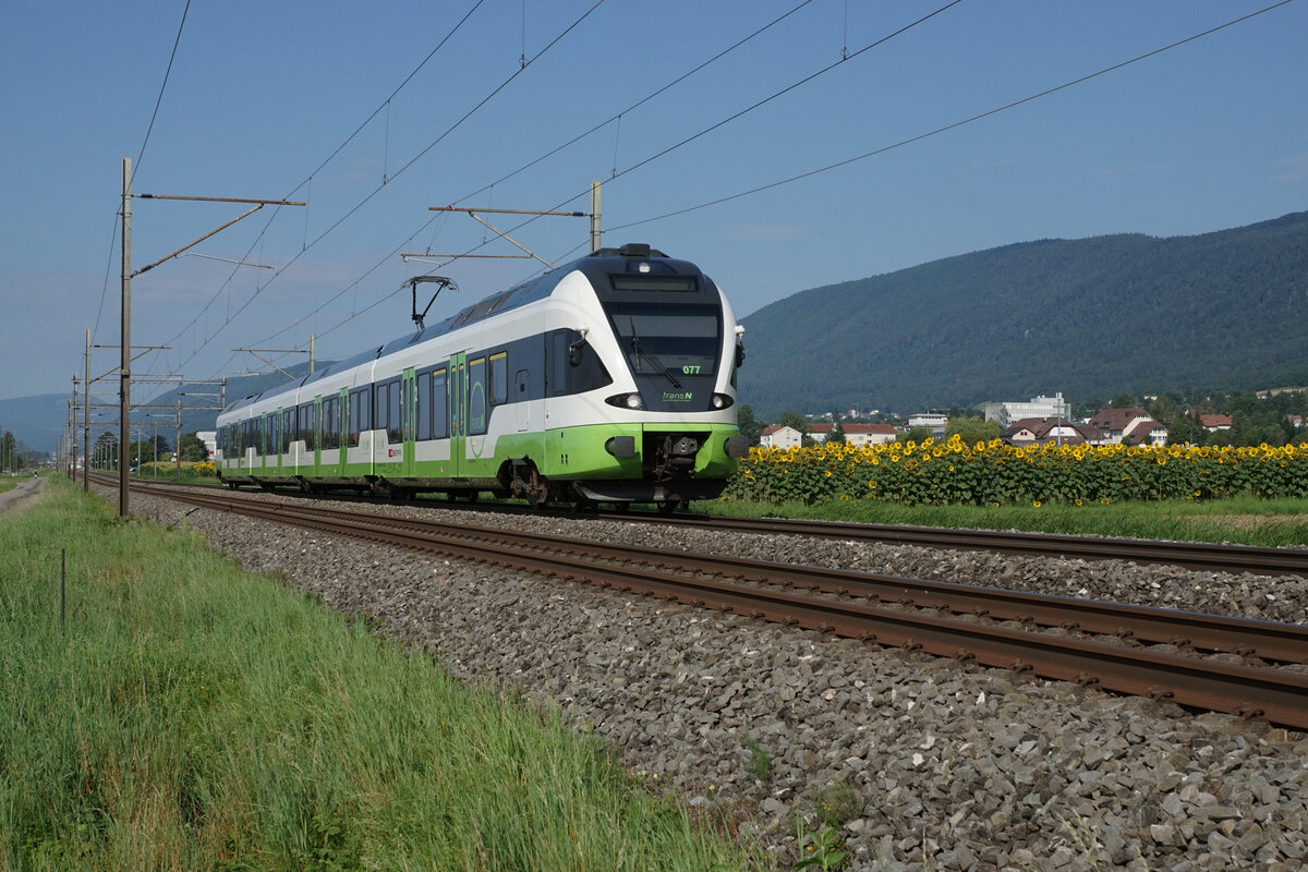 transN Flirt RABe 523 075 als Regionalzug Biel-Olten zwischen Bettlach und Selzach in Richtung Olten unterwegs am 11. August 2021. Foto: Walter Ruetsch