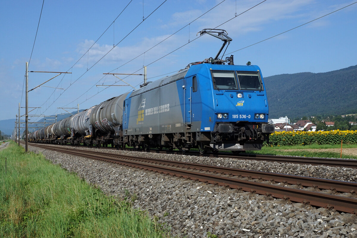 WRS Widmer Rail Services AG. 185 536-0 mit einem Kesselwagenzug zwischen Bettlach und Selzach auf der Fahrt in Richtung Solothurn am 11. August 2021. Foto: Walter Ruetsch