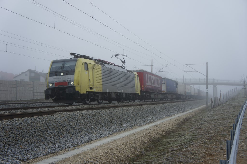 Nur kurz gibt der dichte Nebel den Blick auf 189 926 vor ihrem KLV-Zug in Richtung Augsburg frei (Hattenhofen, 24.11.11).