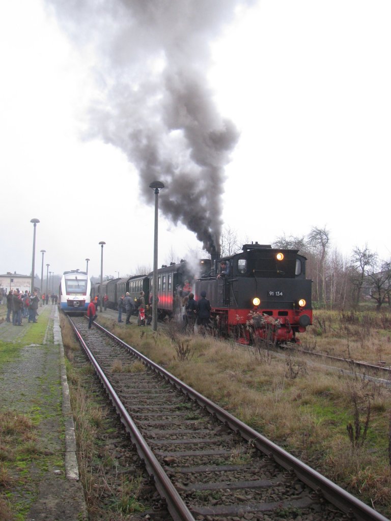 Crivitz Bf; Dampflokomotive BR 91 134 -DR- mit Sonderzug der MEF und ein Triebwagen der  ola , 06.12.2009