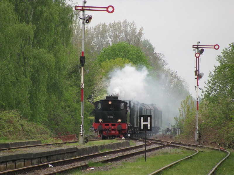 Einfahrt der BR 91 134 -DR- mit dem Sonderzug der MEF aus Hagenow kommend, anläßlich des Bahnhofsfest in Wittenburg [08.05.20109