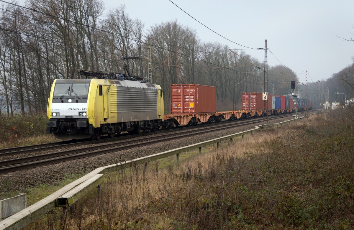 Der gelbe 189 203 von Captrain mit den Rheinhausen Shuttle auf den Haken, kommt hier via Elten in Deutschland