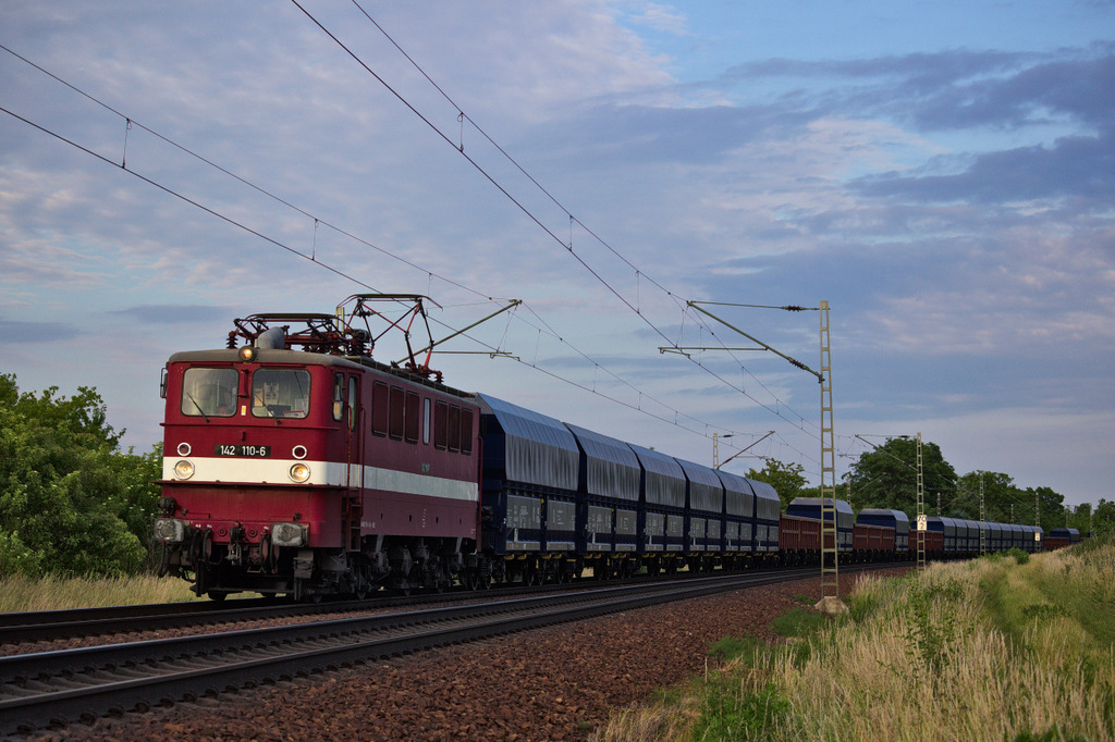 Zu sehen ist die 142 110 der Erfurter Bahnservices am 13.06.17 nahe dem Örtchen Zeithain.