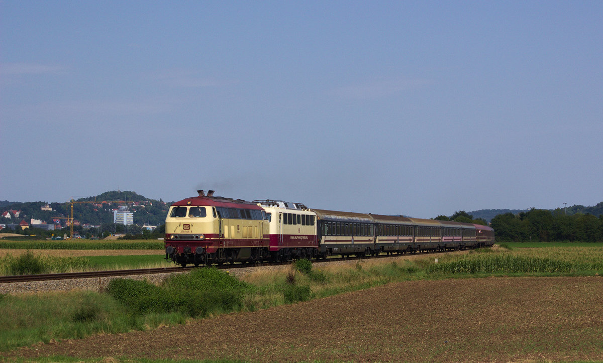 Ein harmonisches Gespann aus 218 105 und 110 169 konnte am 25.08.17 auf der Umleiterstrecke der Rastatt-Sperrung aufgenommen werden.