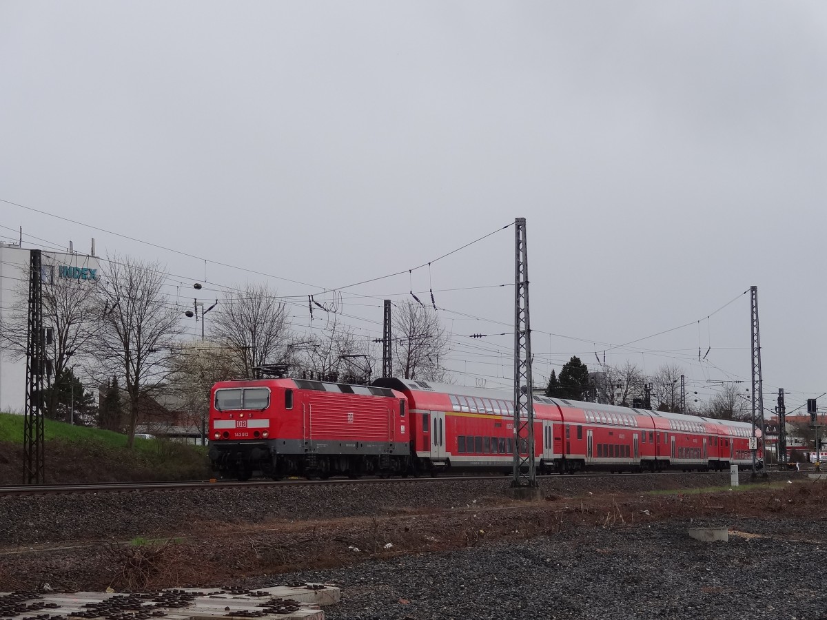 Am 13.4.13 konnte 143 012 mit ihrem Regionalzug, welcher abweichend aus 4 statt 5 Doppelstockwagen bestand, in Oberesslingen aufgenommen werden. Seegurke