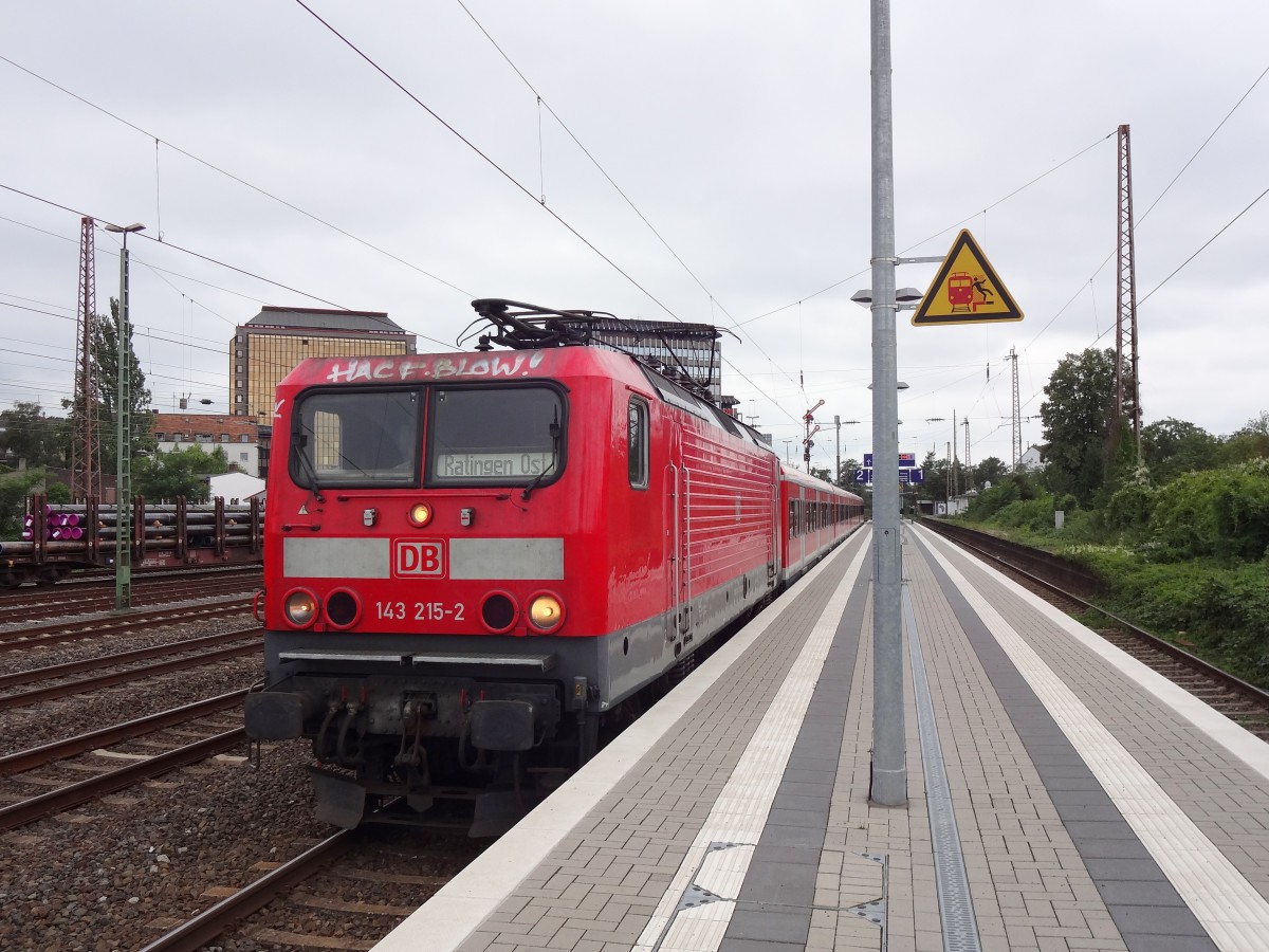143 215 hat vor wenigen Sekunden den Bahnhof Düsseldorf Rath erreicht.