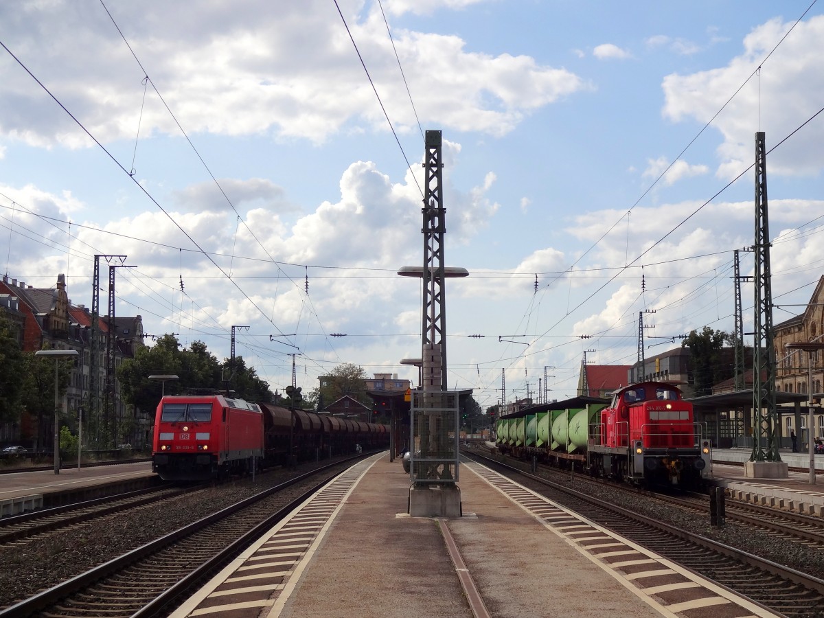 Am 21.8.14 musste 294 810 vor einem roten Signal warten, während auf dem Durchgangsgleis ein ICE durchschoss. Links überholte nun eine 185 mit einem Kieszug, welcher nun den Güterbahnhof von Fürth in wenigen Sekunden erreicht.