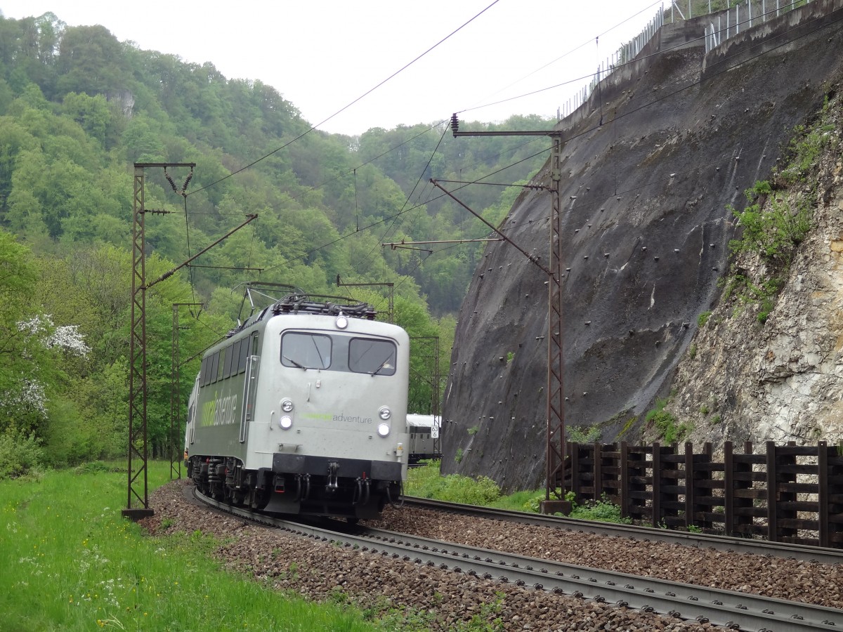 Am 10.5.13 kam die 139 558, welche für Railadventure unterwegs ist, über die Geislinger Steige. Im Schlepp hatte sie neben vielen Schutzwagen auch eine unbekannten Triebwagen, welcher hier auf dem Bild jetzt nicht zu sehen ist. Seegurke