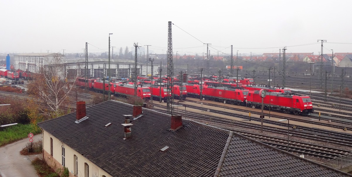 Von der Brücke über den Mannheimer Rangierbahnhof hat man eine gute Sicht auf die abgestellten Loks.
