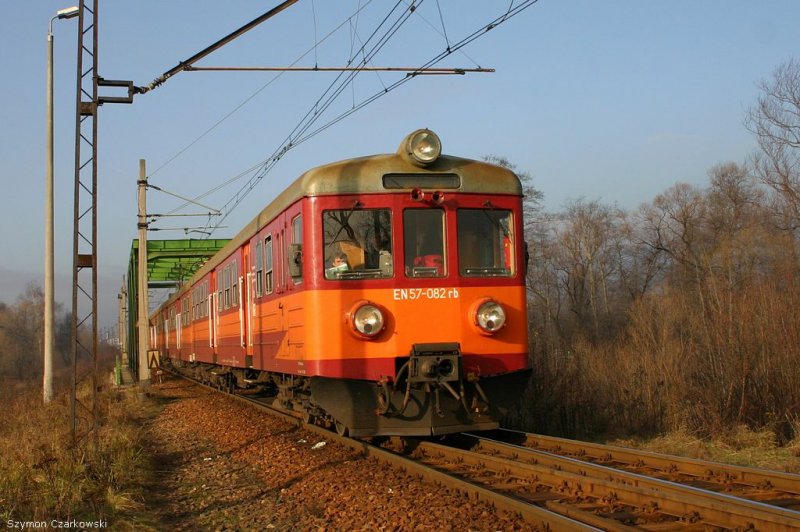 EN57-082 als Personenzug nach Zywiec in Lodygowice, Brücke über Zylica, am 24.12.2006