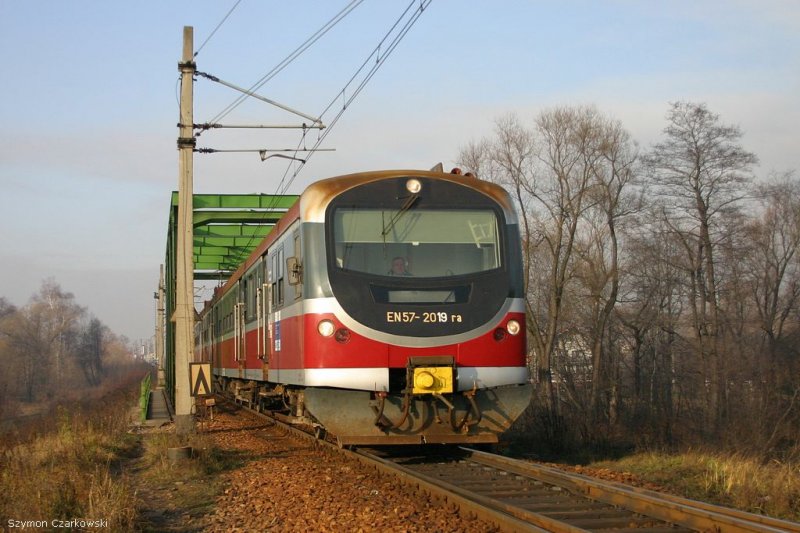 EN57-2019 (ex 2003) als Personenzug nach Zywiec in Lodygowice, Brücke über Zylica, am 24.12.2006