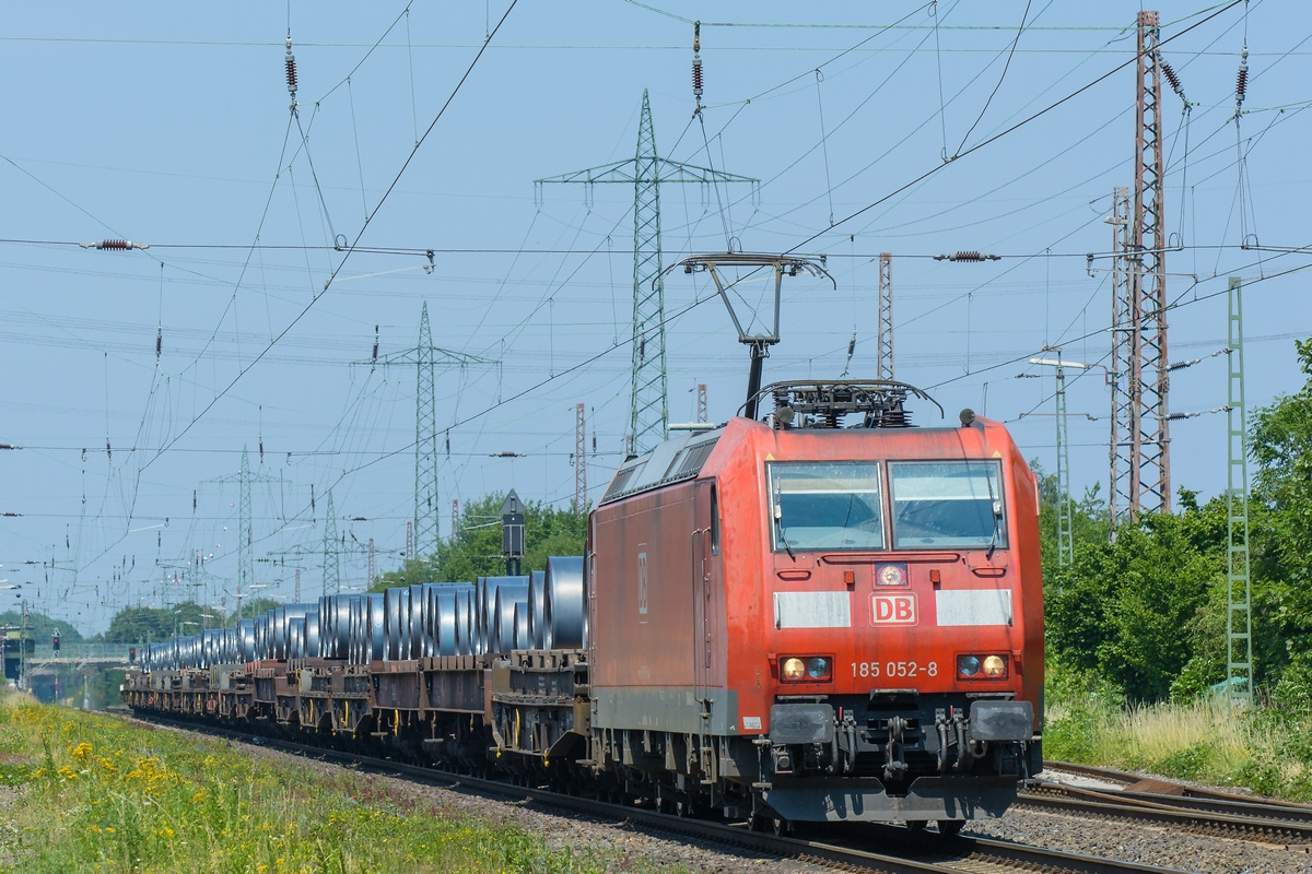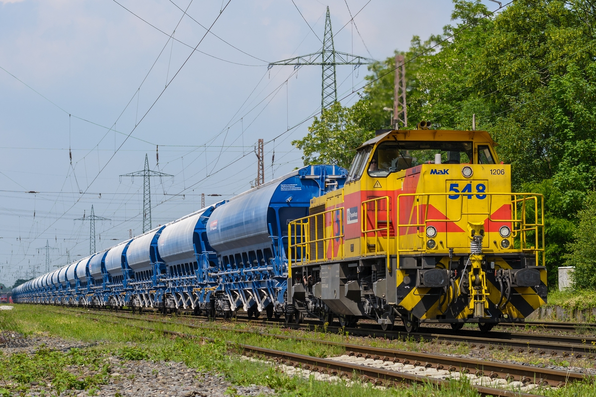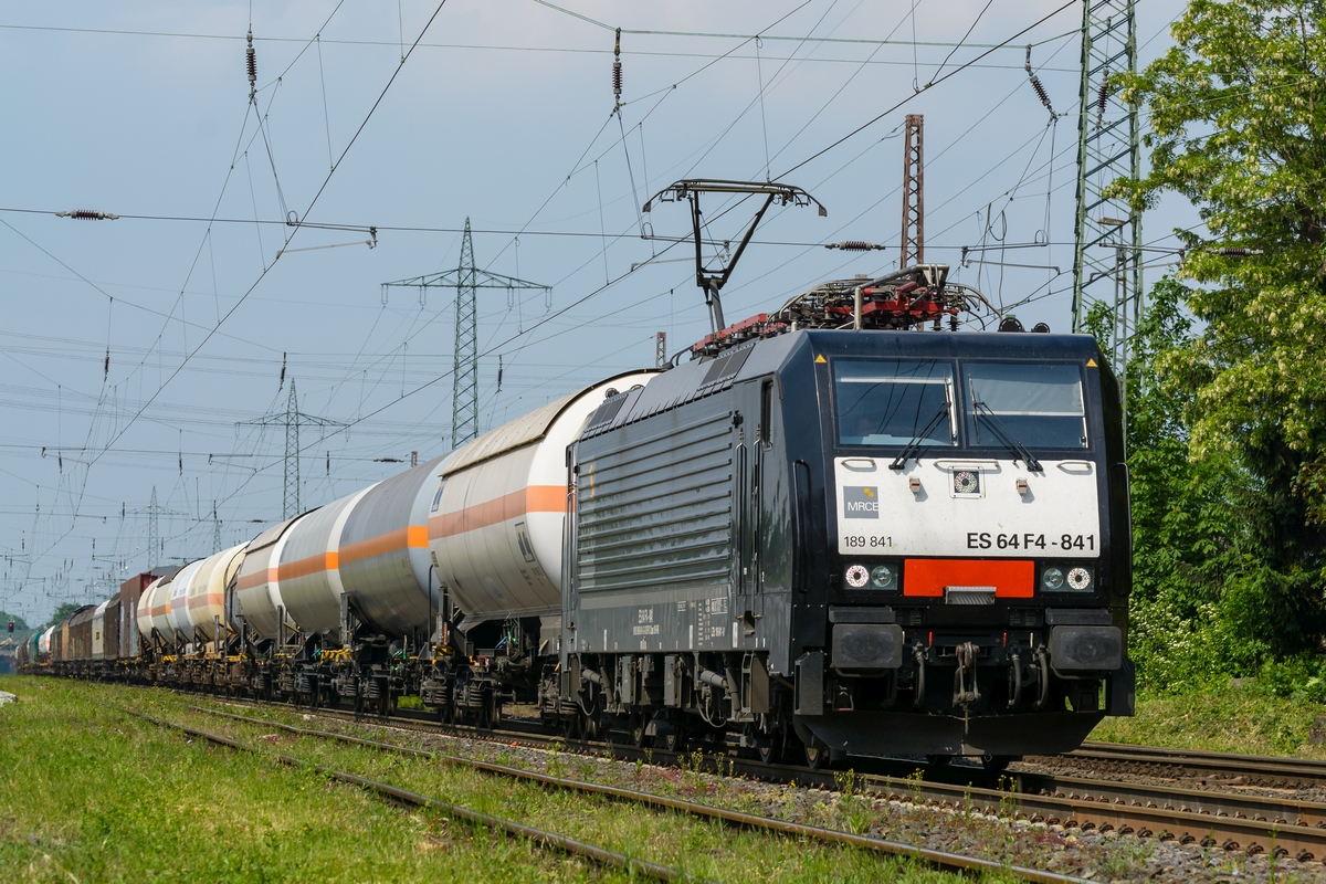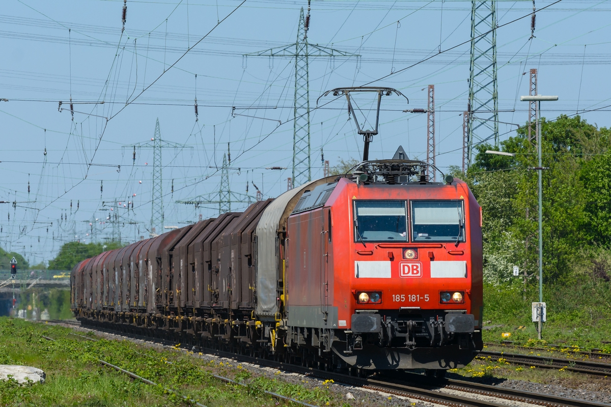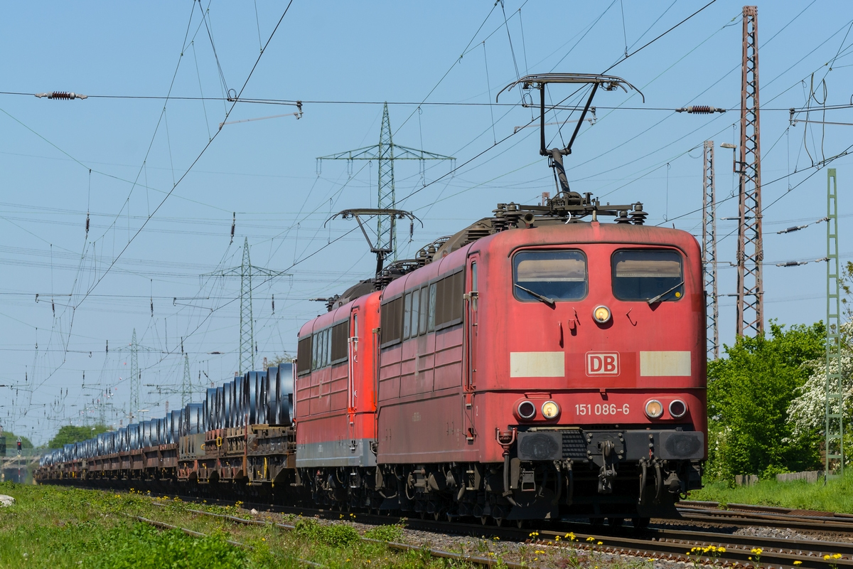 RBH 151 147-6, noch im alten DB-Lack, zieht zusammen mit ihrer schon im neuen Design glänzenden Schwesterlokomotive einen Erz-/Kohlezug am 17.01.2015 durch Düsseldorf-Rath. Daniel W.