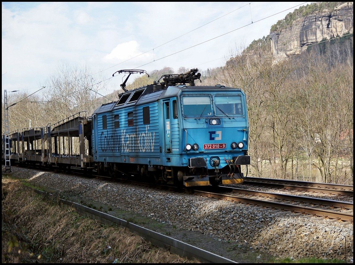 372 010 der CD zwischen Krippen und Schmilka-Hirschmühle. Aufgenommen am 27.03.2014
