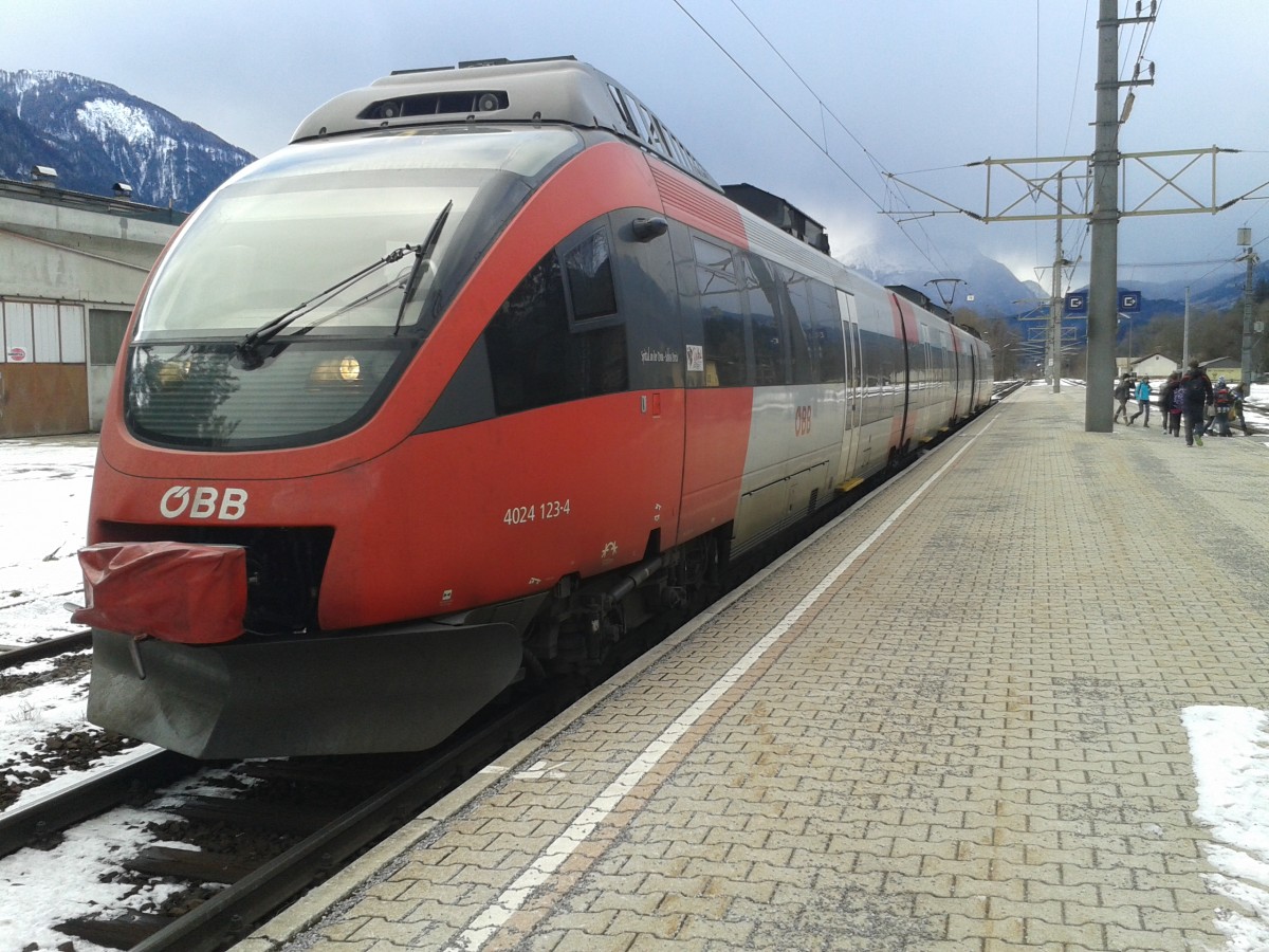 4024 123-4 als R 4865 auf der Fahrt von Lienz nach Spittal Millstättersee. Hier zu sehen am 27.1.2015 im Bahnhof Dellach im Drautal.
