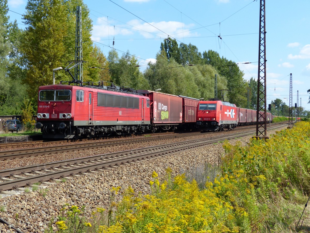 155 201 fährt mit einen Güterzug am Haken am 28.08.2014 durch Leipzig-Thekla.