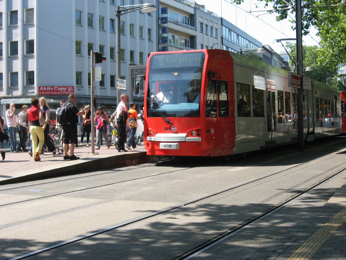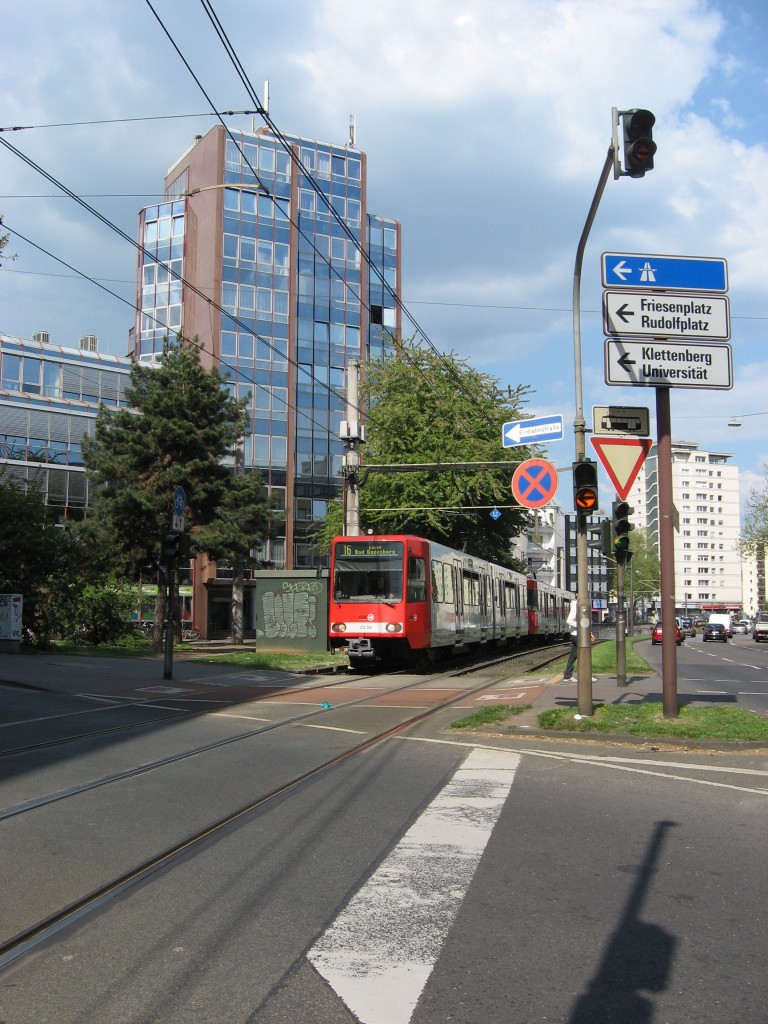TW 4105 mit einem 2. unbekannten Wagen der gleichen Serie unterwegs am 19.5.13 als Linie 12 Richtung Zollstock cvom Bahnsteig der Haltestelle Eifelplatz aus fotografiert. Johannes Schwarz