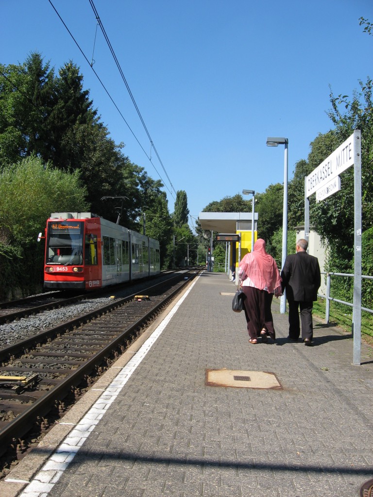 TW 5145 zusammen mit einem 2. unbekannten Wagen unterwegs am 26.7.09 als Linie 4 Richtung Schlebusch; hier aufgenommen bei der Einfahrt der Haltestelle Im Weidenbruch. Johannes Schwarz